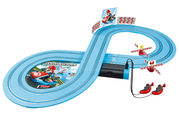 Mario Kart 8 racebaan van Carrera First. Op dit circuit racen Mario en Yoshi tegen elkaar. Wie behaalt de snelste rondetijd op deze Mario Kart 8 racebaan met een lengte van 2,4 meter? Deze set werkt op batterijen (niet inbegrepen). Een ultieme racebaanset voor kids vanaf 3 jaar.