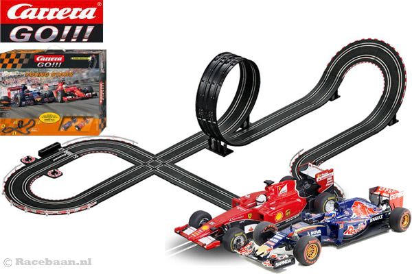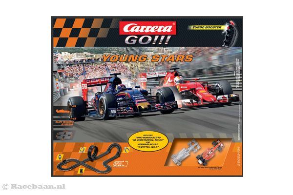 Carrera Go Formulie 1 racebaan Young Stars. Stoere racebaan met een lengte van 6,3 meter voorzien van een dubbelbaans looping, mechanische rondeteller en twee controllers met turbo booster. Verplaats je in de wereld van Max Verstappen en ga met zijn Toro Rosso STS10 de race aan met Sebastian Vettel in zijn Ferrari SF 15T. Leverbaar in een gelimiteerde oplage!